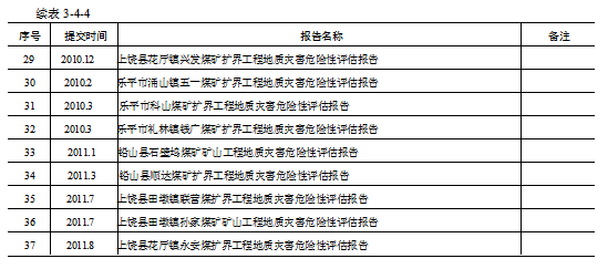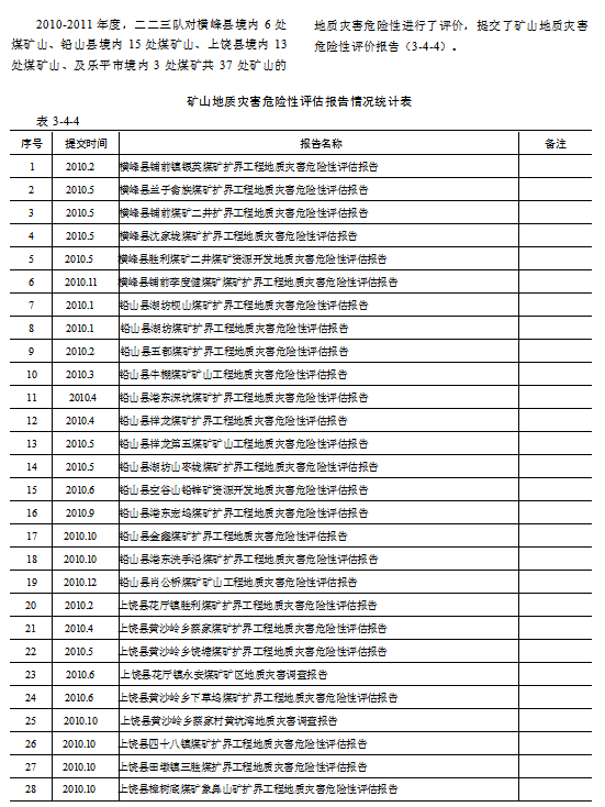 2009 年度,二二三队对横峰县境内6处矿山、铅山县境内8处煤矿山、上饶县境内6处煤矿山、及乐平市下涌山煤矿共21处矿山的地质灾害危险性进行了评价,提交了矿山地质灾害危险性评价报告(表3-4-3)。