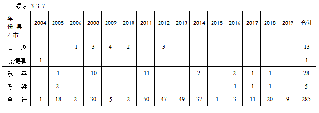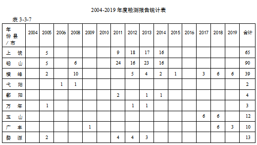 进入21世纪,随着全国经济形势的逐步好转,对能源需求日趋迫切,各地方人民政府也在加强对矿产资源尤其是煤炭的监督管理,要求矿山对其采矿证内的资源储量开展年度动态检测工作。自2004年始,二二三队应自身队伍生存发展需要,主动走出去在赣东北地域内为小煤矿的资源储量动态检测工作开展服务工作,至2019 年为50 家小煤矿和其它非煤矿山共提交285 件“矿山储量动态(或年度)检测报告”(表3-3-7),分年度提交检测报告有: