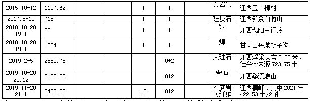 2019年10月至2020年12月,在婺源县浪山矿区瓷土/瓷石矿勘探期间委托社会钻机2台(便携模块化液压500型)完成钻探工程量2125.33米。