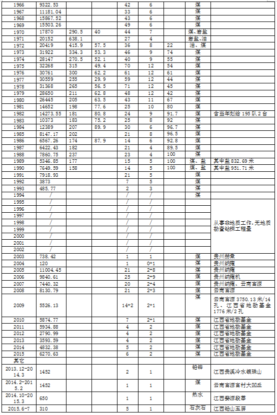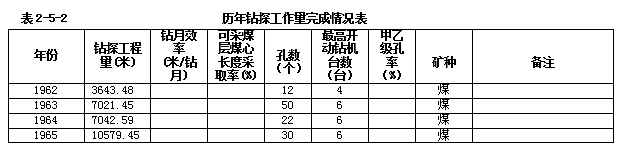 自1962年至2020年二二三队从事煤炭地质勘查完成钻探总工作量52.81万米,其中省内48.44万米,贵州云南等省外4.37万米;完成其它矿产勘查钻探工作量4.45万米(表2-5-2)。